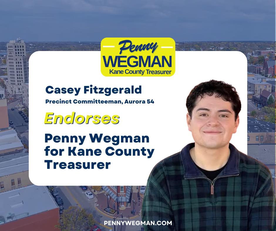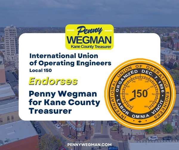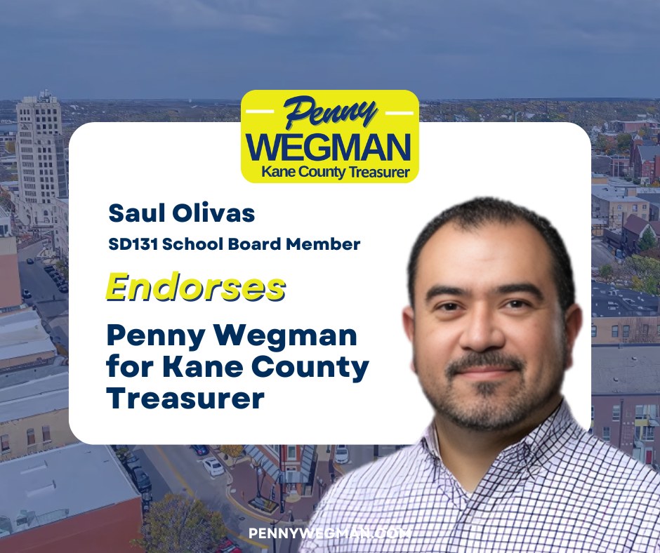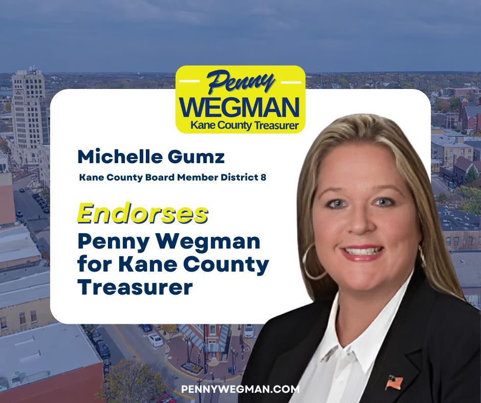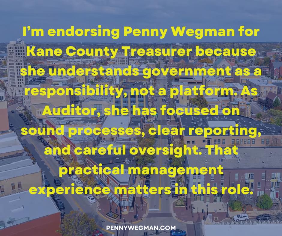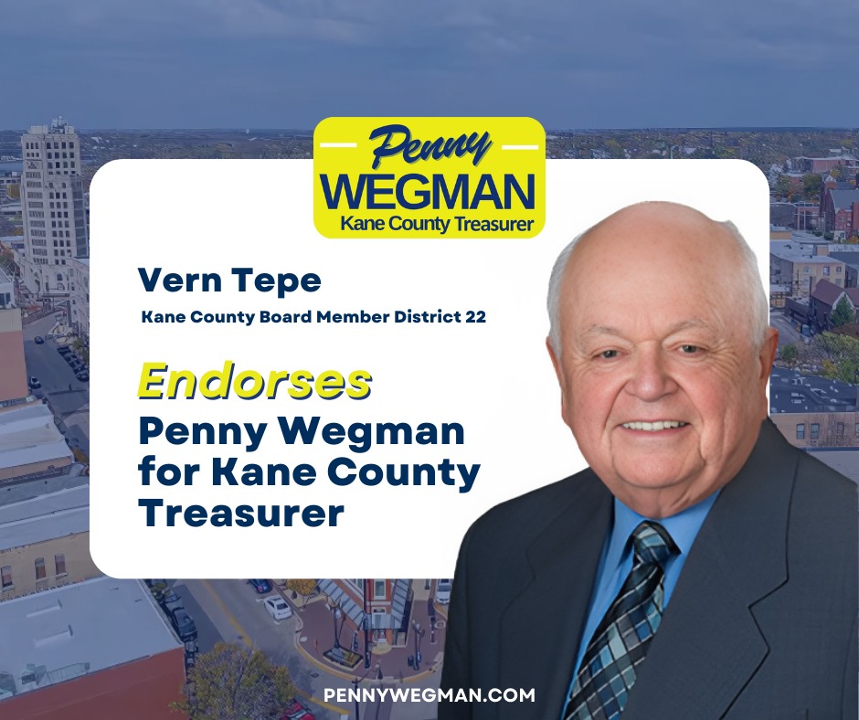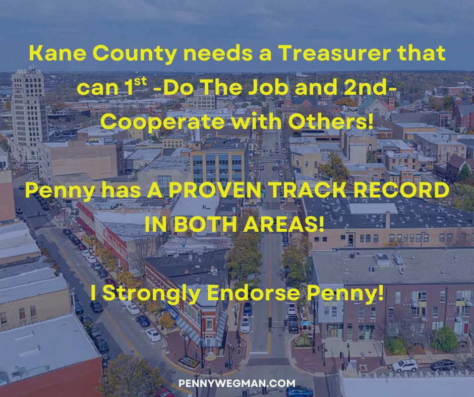 I am honored to endorse Penny Wegman for Kane County Treasurer. Having known Penny for many years, I have seen firsthand her unwavering commitment to our community and her exceptional attention to detail in everything she does.