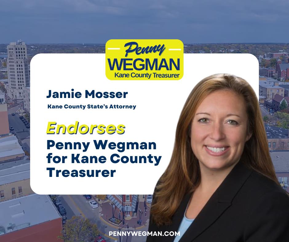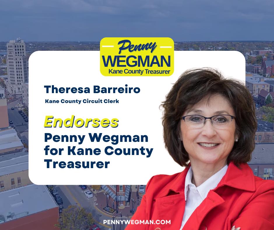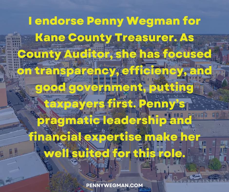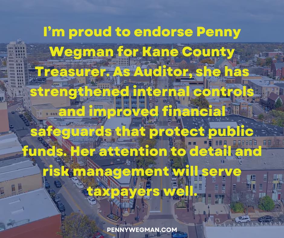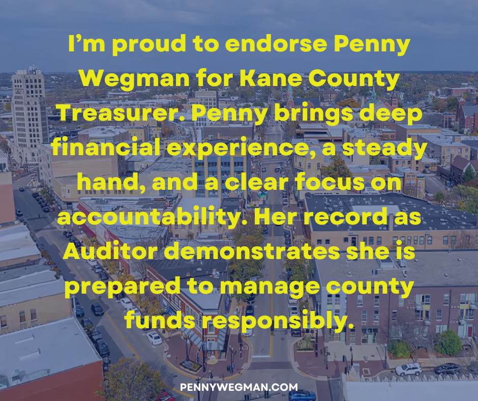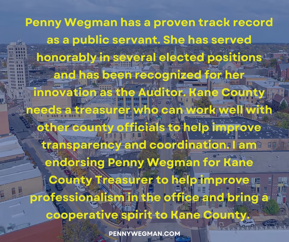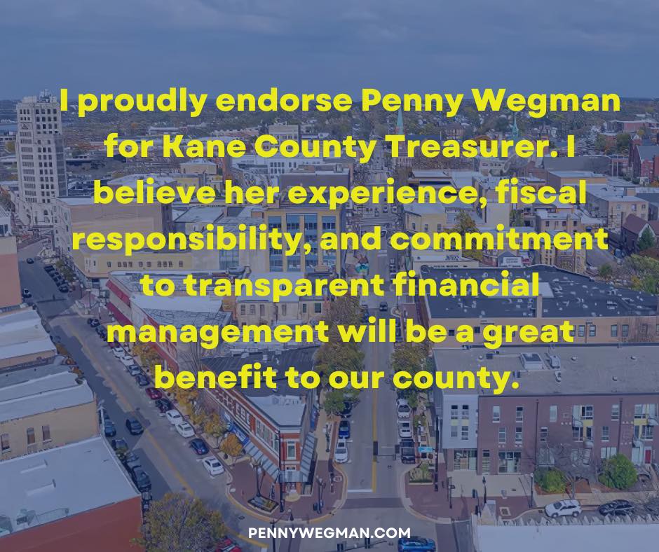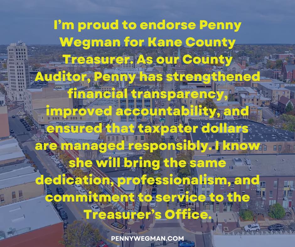 I am honored to endorse Penny Wegman for Kane County Treasurer. Having known Penny for many years, I have seen firsthand her unwavering commitment to our community and her exceptional attention to detail in everything she does.