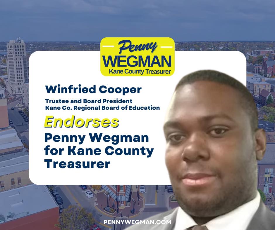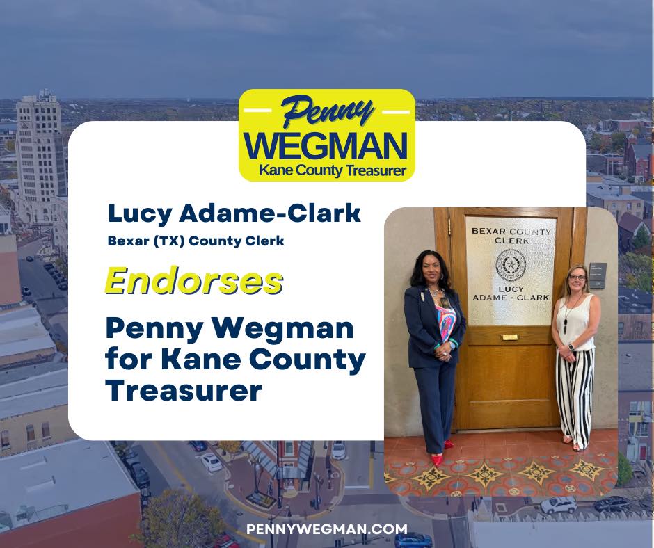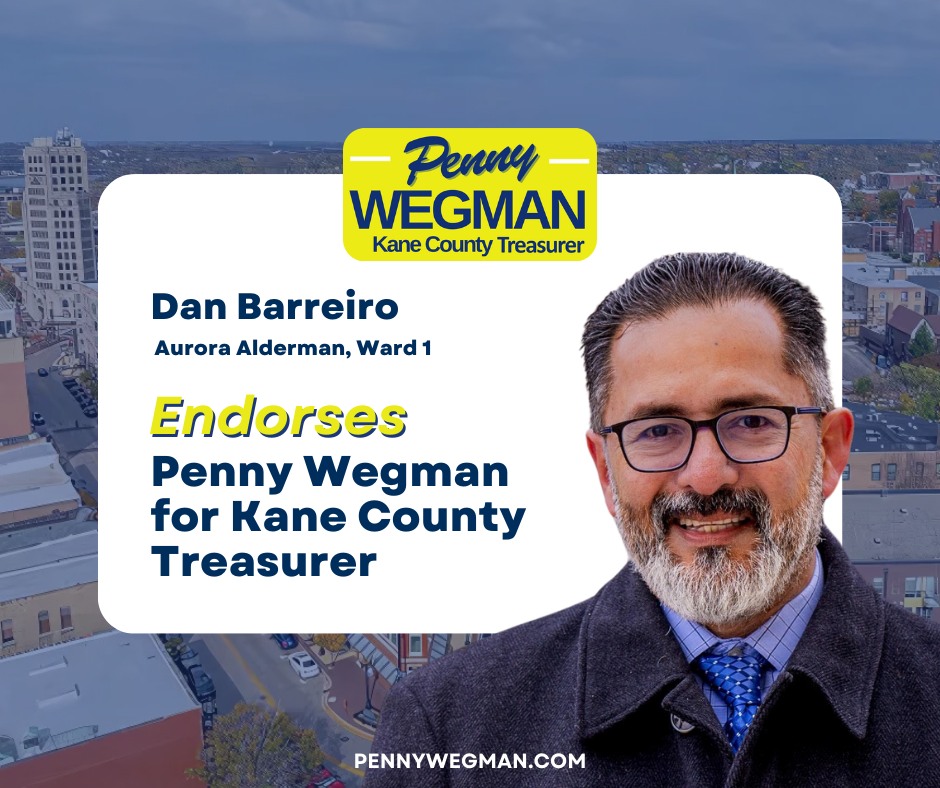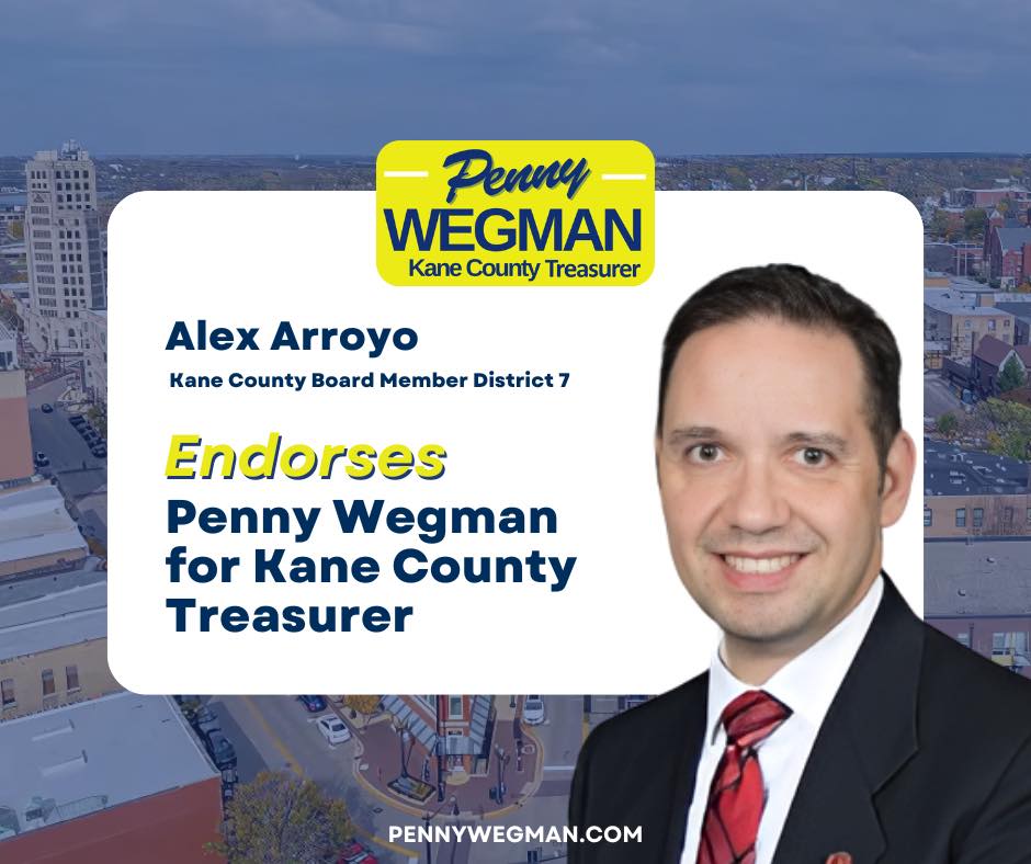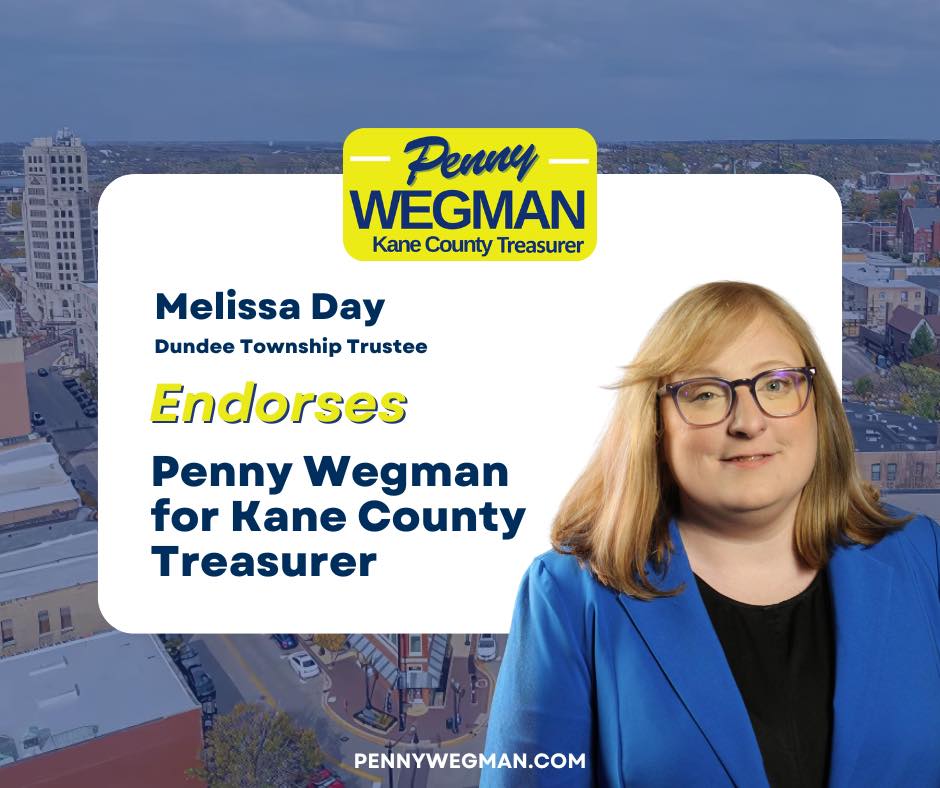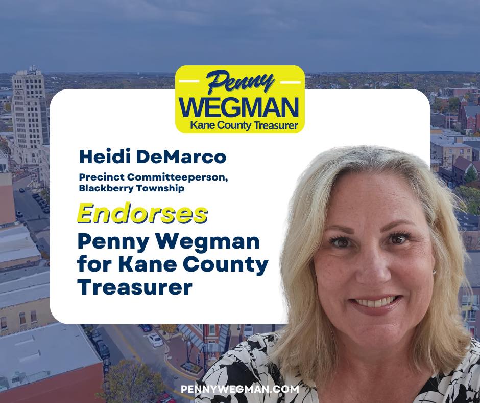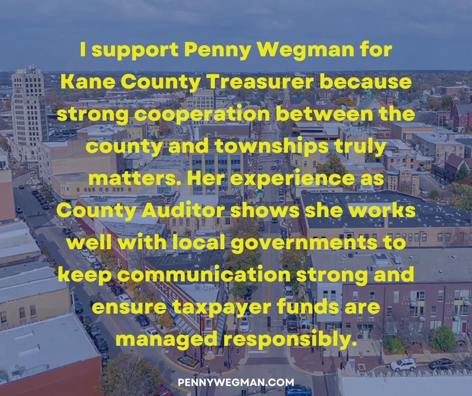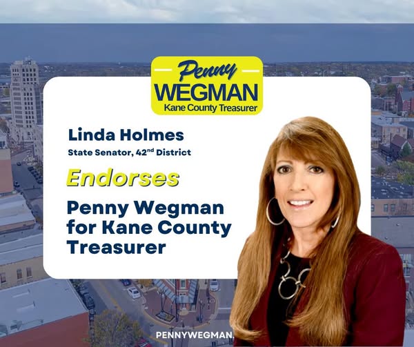 I am honored to endorse Penny Wegman for Kane County Treasurer. Having known Penny for many years, I have seen firsthand her unwavering commitment to our community and her exceptional attention to detail in everything she does.